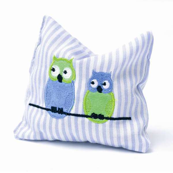 Katzenspielkissen Lilo mit lustigem Eulenmotiv auf Streifen-Design in hellblau/weiß. Gefüllt mit Baldrian und Dinkelspelz.