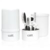 Die Pflegewerkzeuge werden aufrecht in einem praktischen Behälter aufbewahrt.